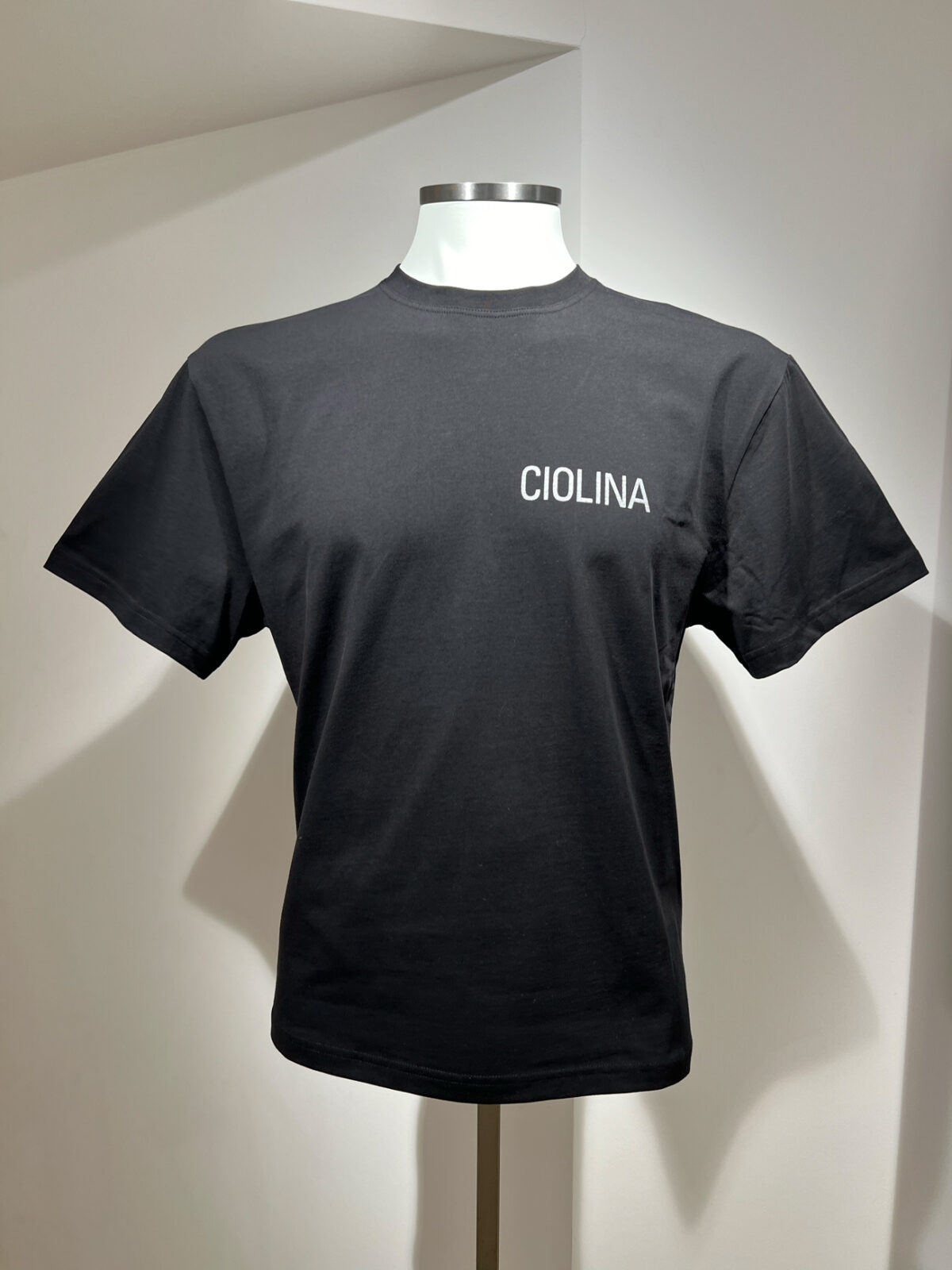 Schwarzes T-shirt mit Labelspiegel auf dem Rücken. Exklusiv und nur bei Ciolina!