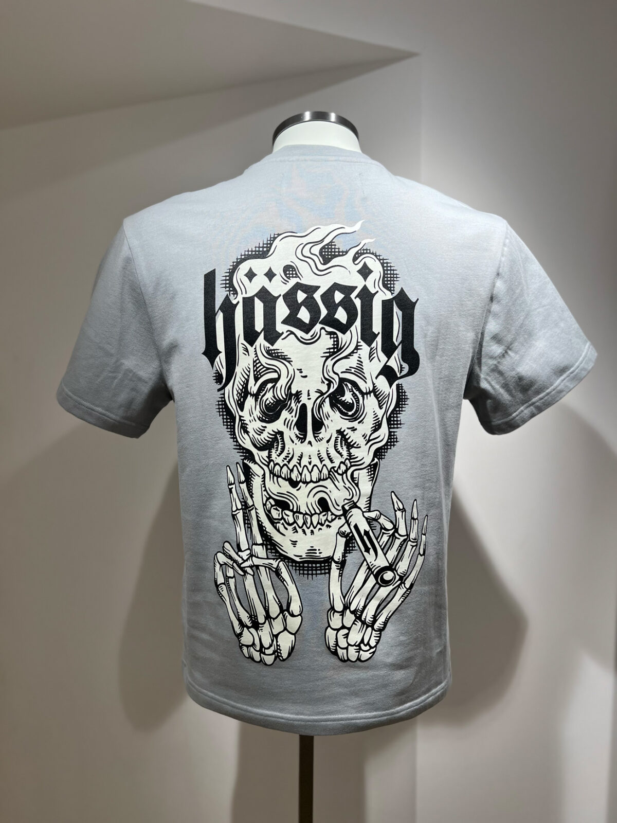 Graues Hässig Shirt mit Totenkopf-Sujet auf dem Rücken.