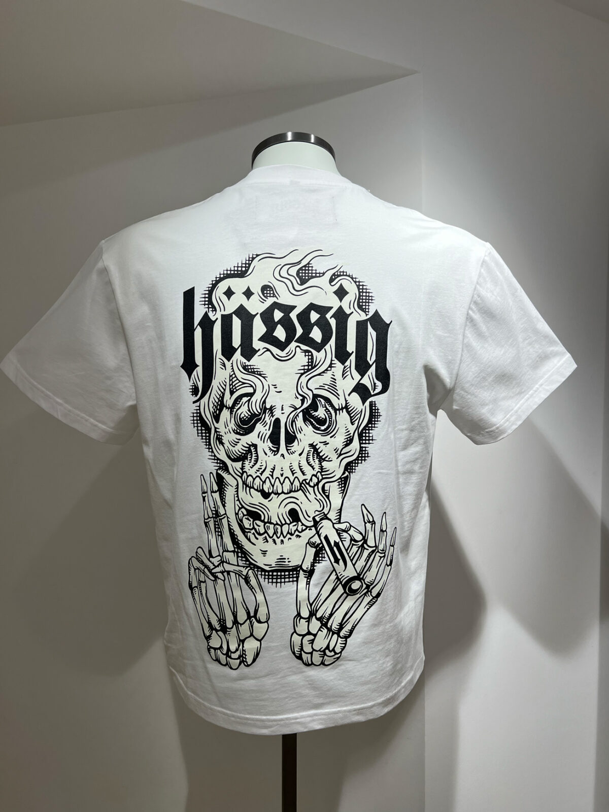 Weisses Hässig Shirt mit Totenkopf-Sujet auf dem Rücken.